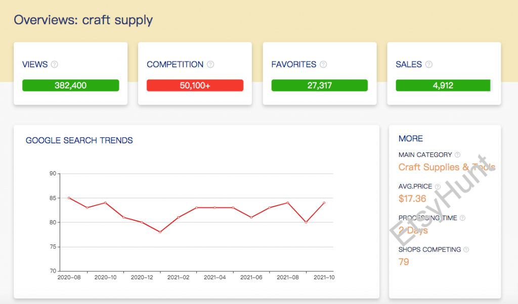 Crafts products as the most popular category in Etsy. The search trend always keeps a high research rate. The total views are already more than 382,400.