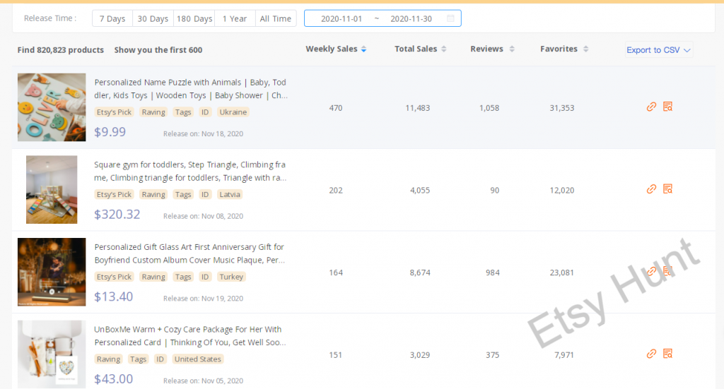 In the beginning, let us review last year what products reached top sales through EHunt. Now, we selected a date from 01/11/2020—30/11/2020.