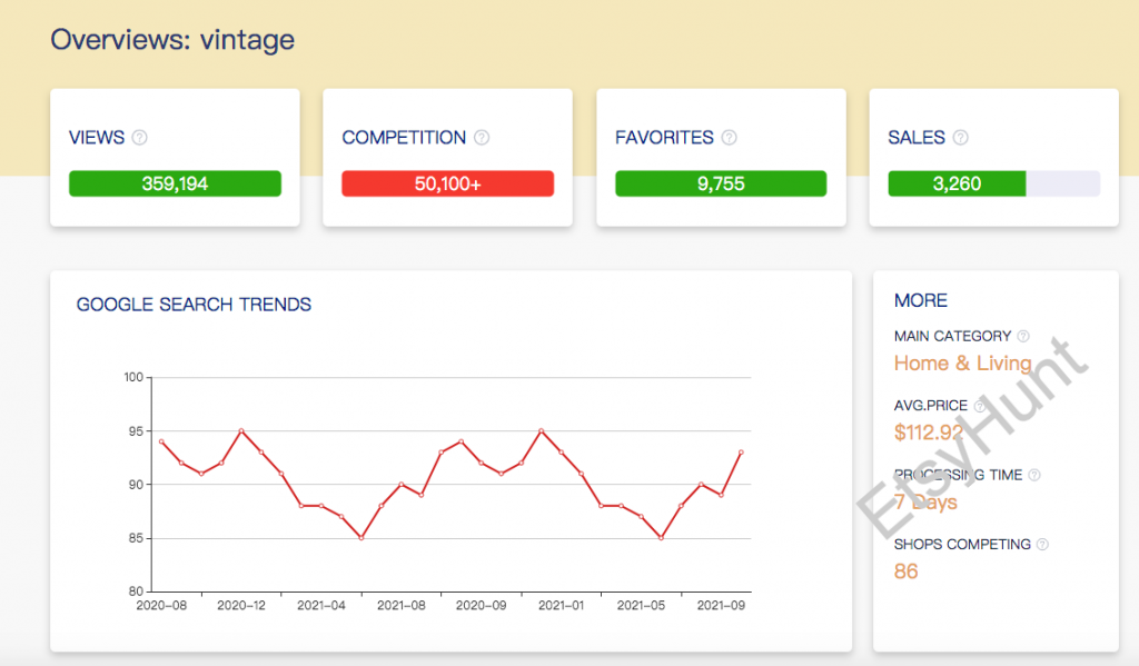 From EHunt keywords tool, we can clearly find vintage products reached the highest sales on Etsy Black Friday 2020, and the popularity of research has also kept the rise recently. Therefore, vintage products will become another popular category on Etsy Black Friday 2021, more than 90% of vintage sellers will change discounts up to 40%.