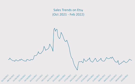 When we take a look at the figures regarding sales trends between October 2021 and February 2022 covering both Etsy Black Friday & Cyber Monday, as in the case of other online shopping platforms, the sales increased at a breakneck speed from 26th through 30th November.
