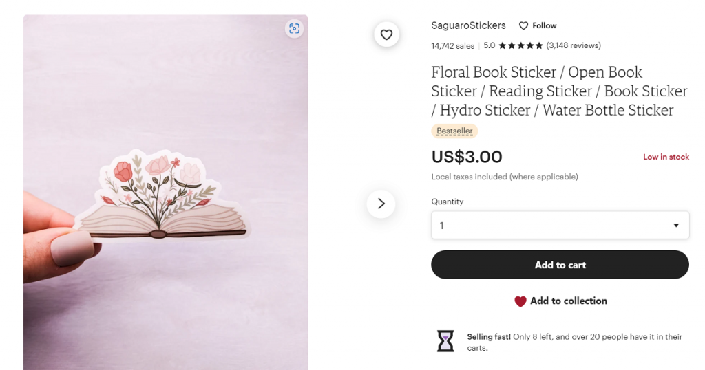 - With a price of $6, the product has 111 weekly and 2.222 total sales. It has 574 reviews totally and 4867 favs, making it a compelling item in the arena.