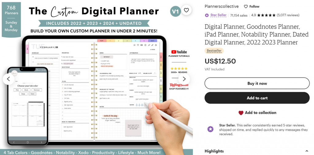 - Titles include the following: Digital Planner, Goodnotes Planner, iPad Planner, Notability Planner, Dated Digital Planner, and 2022-2023 Planner.