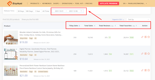When it comes to searching the most popular items during these occasions in detail, EtsyHunt Product Research Tool is the perfect tool to give you exactly what you need to get the most out of it. Let's see what this useful tool can do when specifying the dates.
