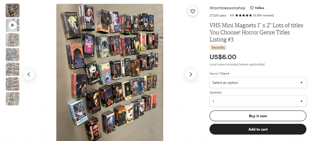 - Tags include the following: Michael Myers, magnet, horror movie, Halloween, horror, 80s horror, horror movies, VHS, mini VHS, custom horror.