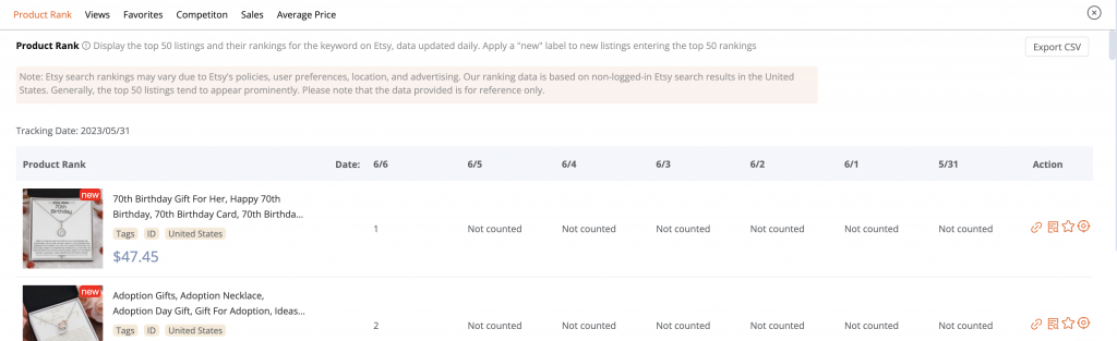 EHunt also allows you to track the Etsy ranking of your desired keywords. This keyword tracking feature helps you understand market trends and monitor changes in keyword rankings. By optimizing your Etsy SEO strategy based on this information, you can increase your shop's visibility in Etsy search results, drive more traffic, and boost conversions.
