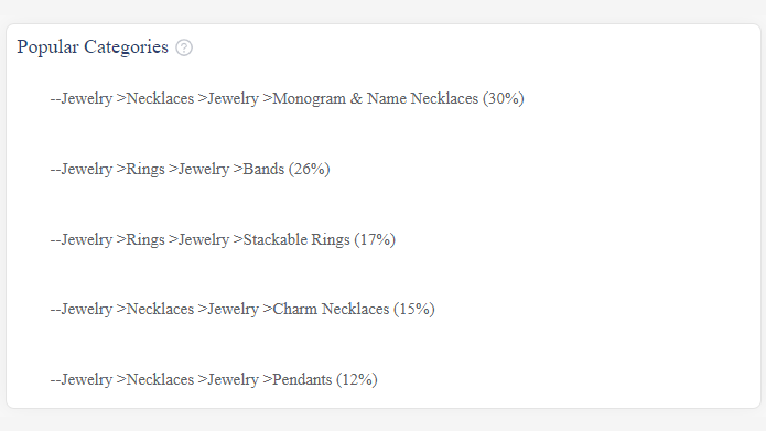 Sales can seem a little low, but this is because we searched for a generic category. We can use the “popular categories” section to get an insight into the possibilities that personalized jewelry offers: