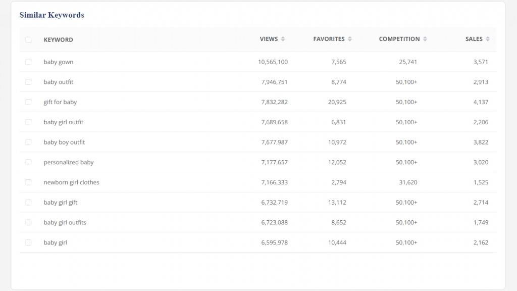 The remarkable keyword would be “baby gown” with more than 10 million monthly views! It is also the top on sales with 3571 this month, and also it has relatively little competition.