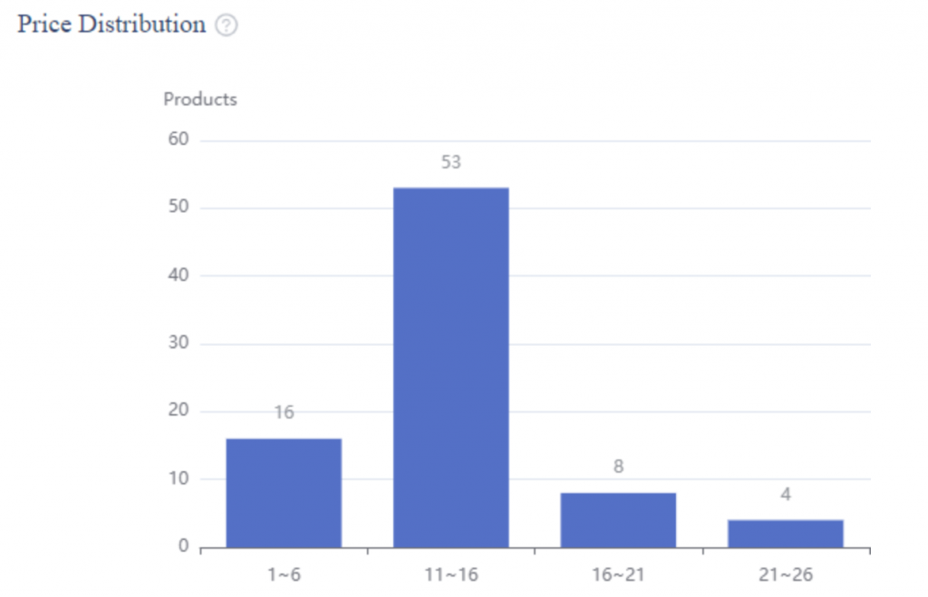 Taking the highest amount of products in a single bracket, we have that 11~16 is the most populated price range. Multiplying it by the average sales per month gives us a total of 11 to 16 thousand, just in this generic category. It could be higher depending on the specific soap type.