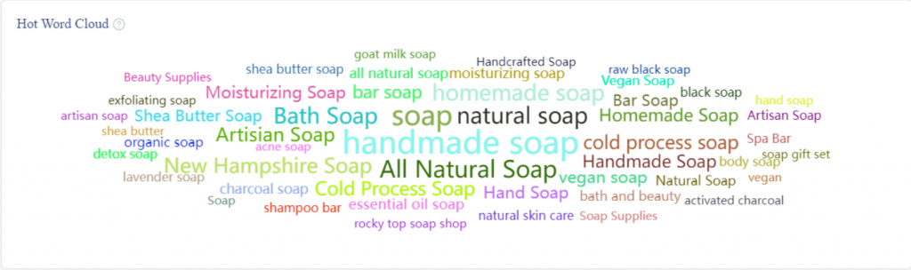 Now that we have the criteria established and know how to apply them, it’s time to check what other possibilities Etsy soap has to offer. Thanks to the Hot Word Cloud section of EHunt’s keywords tool you can have a quick look at related keywords that may be of interest.