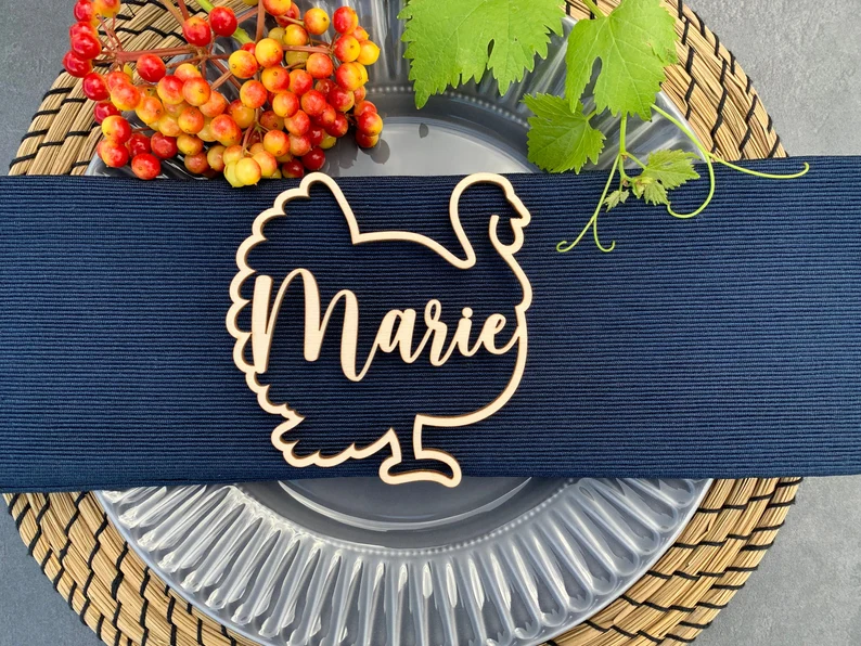 Give your table a personalized touch with these personal Thanksgiving name cards. All are made of Baltic birch plywood, laser cut with the name of your choice upon request.