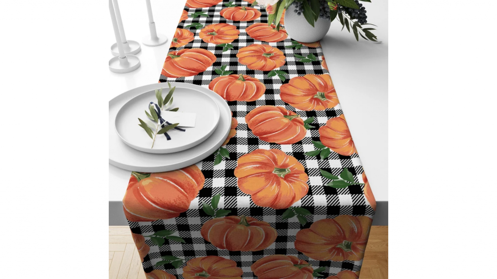 Imagine these fall-themed table runners welcoming your family and friends to your Thanksgiving table. This is a high-quality farmhouse table decor with withe and orange pumpkins and a fall-colored checkered design.