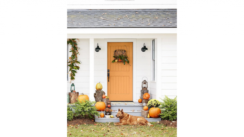 A tobacco basket brimming with mini pumpkins, gourds, magnolia leaves, and a garland dotted with bittersweet vines. In addition, a few wood logs and a scattering of pumpkins are all you need to make your entrance hall the most inviting on the block.