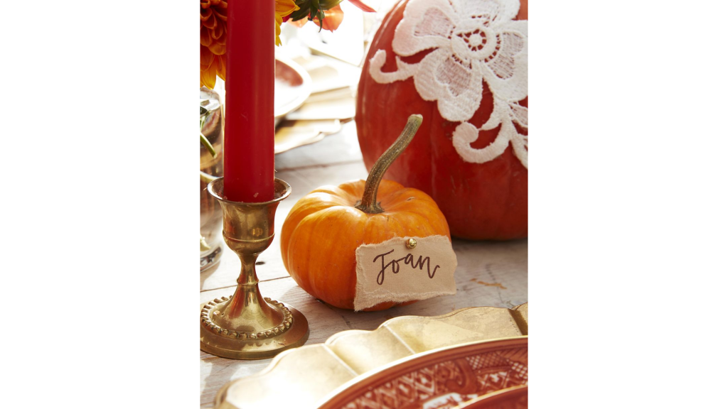 A fancy gold push pin, rough torn card stock, and a cute mini pumpkin are all that this name card requires to be amazing. Use it to assign places for your guests, family, or friends, so everyone knows where to sit in a very Thanksgiving manner.