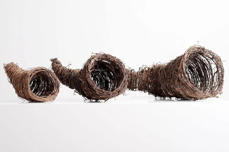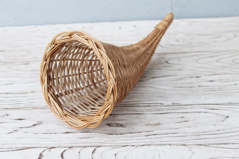 This large braided cornucopia is made entirely of hand-picked natural vines on the riverbanks. It can be used to hold flower arrangements or as a centerpiece for a Thanksgiving table with some seasonal fruits and vegetables.