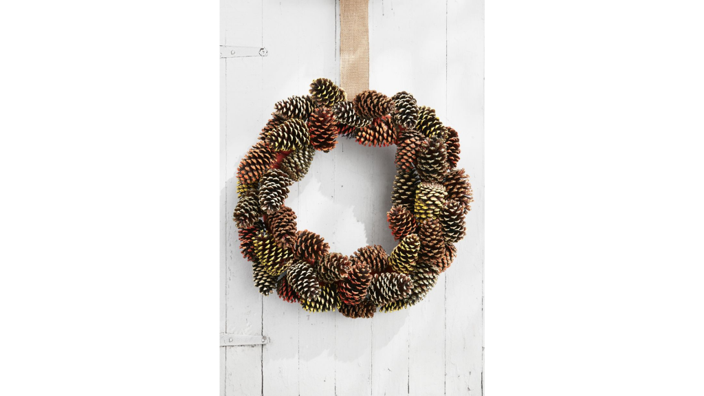This is a natural ornament. The wreath was made with natural pine cones. All pine cones are hand wrapped together to form a lovely wreath shape.