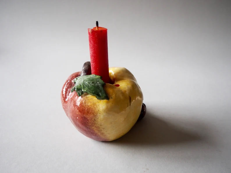 Your Thanksgiving table will not need any other candlestick holder with these one-of-a-kind, vintage apple and walnuts pattern ceramic handmade candle holders.