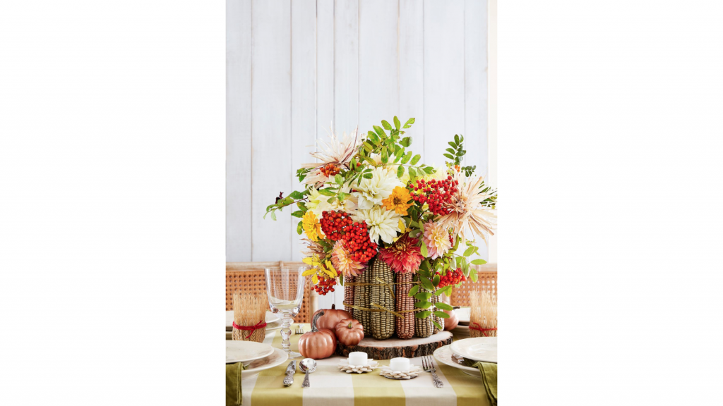 For Thanksgiving, it’s mandatory to have a few cobs of corn, and while more, the better it will be. The holiday staple felt original, fresh, and inspired when coated with silver paint and placed around a lush bouquet. You can add seasonal flowers as desired; this sampling includes zinnias, dahlias, and mountain ash berries.