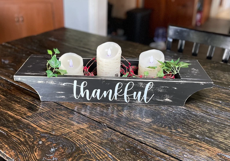 This rustic farmhouse centerpiece box will take your breath away. It is personalized with "thankful" and "blessed" on the other. The ends are rounded in a sleigh fashion. It's perfect for a living room side table centerpiece, mantel decor, or a Thanksgiving dining table centerpiece.