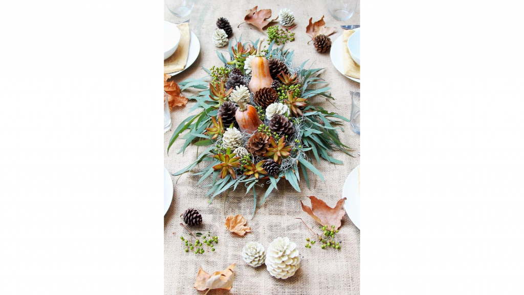 Every Thanksgiving table requires a seasonal, lovely centerpiece. That's why you'll adore this one, which features gourds, pine cones, and foliage for the ultimate fall nod.