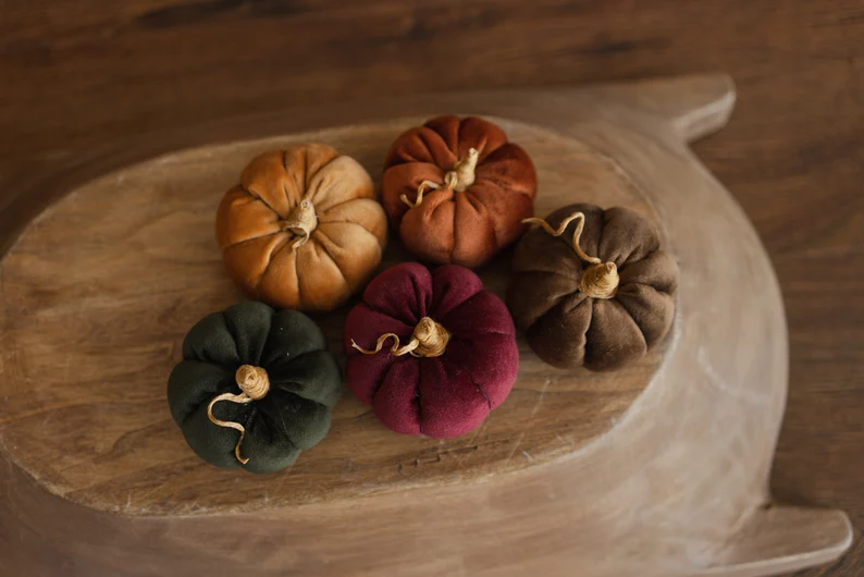 These adorable small Velvet Pumpkins are perfect for Thanksgiving props or table decorations this year. They have natural pastel and soft shades that are ideal for taking photos because they do not drop reflections and are also very easy to mix and match.