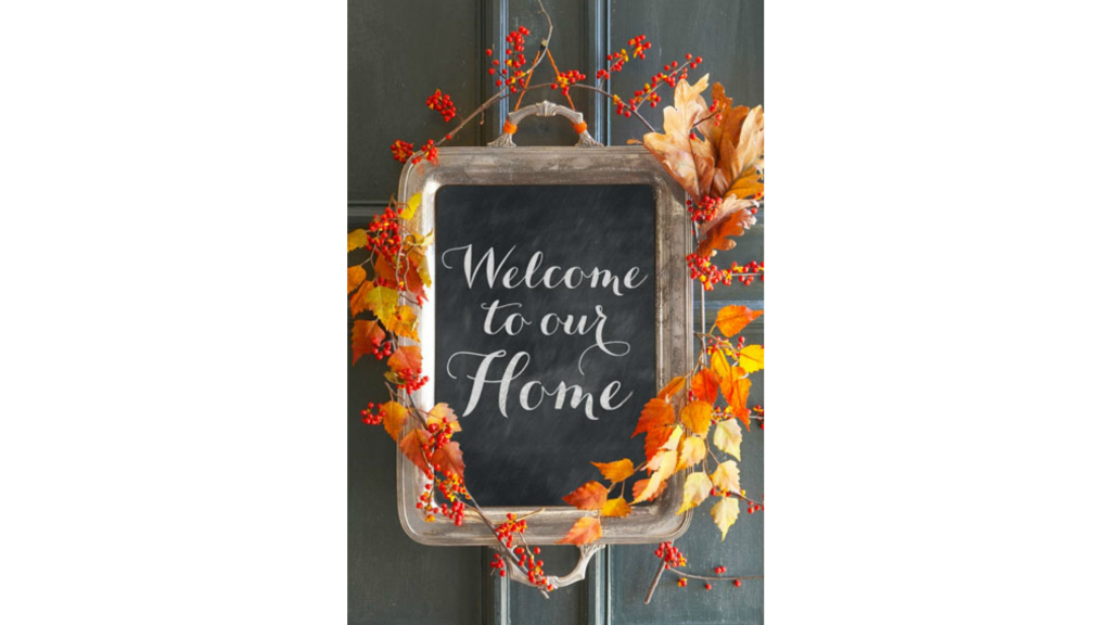 This charming option for a fall wreath will greet guests. It's just a layer of chalkboard paint on the inside of an old tray with some bittersweet berries and autumn branches on the sides for a seasonal touch. However, it is lovely and gives a warm feeling when you see it.