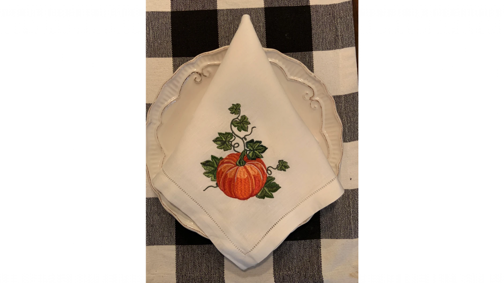 These are beautiful hand-embroidered linen Thanksgiving napkins featuring an elegant pumpkin, perfect for use during fall and especially at Thanksgiving dinner.