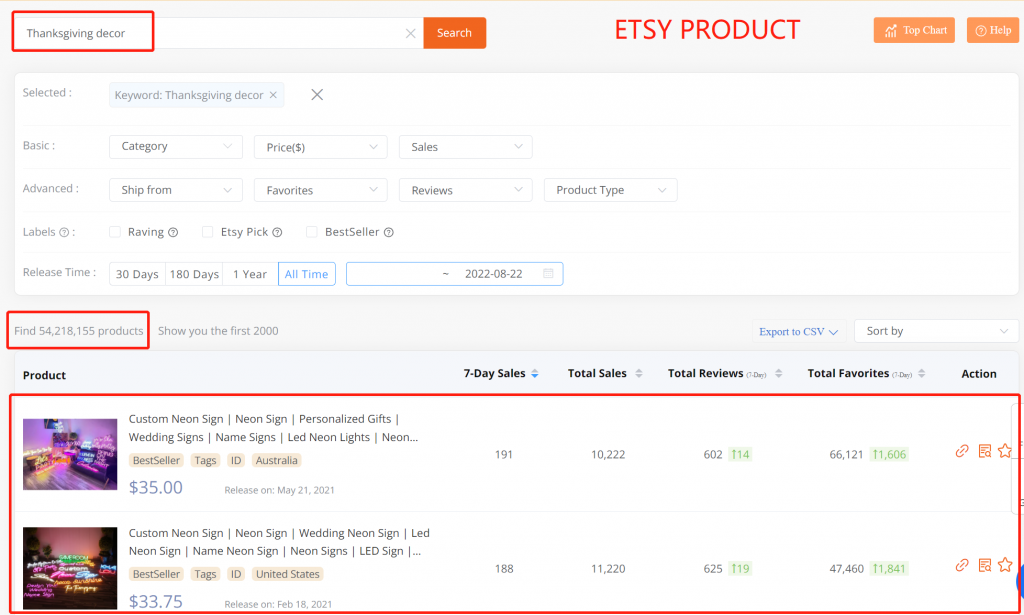 Just give it some keywords to work with. For instance, we used “Thanksgiving decor” and it found 67,642 products matching those criteria.