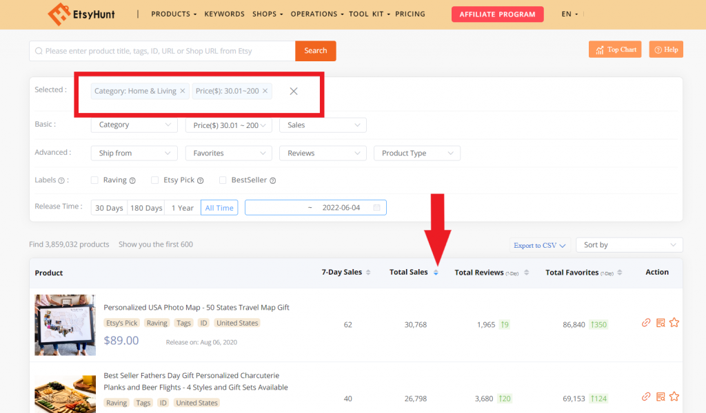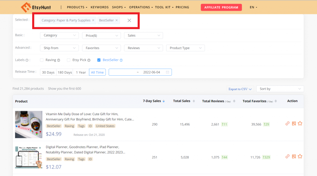 Now let’s have a close look at how to comprehend which products are demanded more in the Paper & Party Supplies category. EtsyHunt Products Research Tool will again be your first assistance with which you can simply filter and list the top products sold in the category. see below