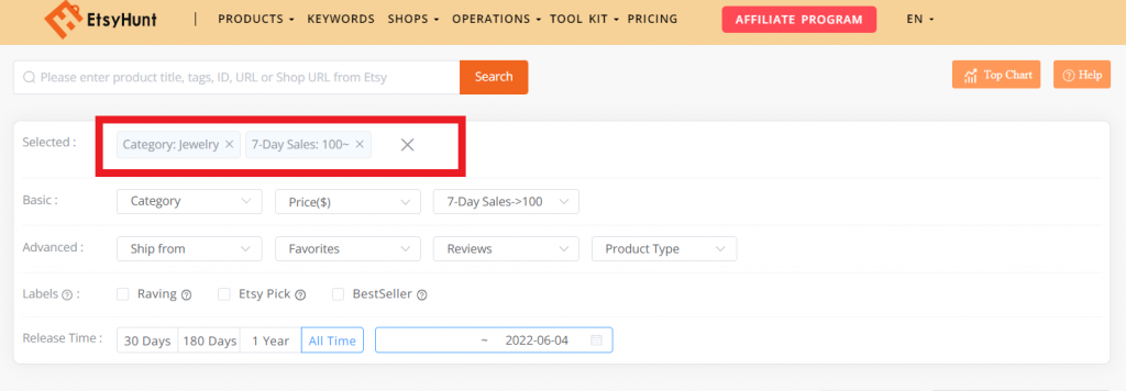 Now, you can try to filter Jewelry products by 7-Day sales and list shops that sold more than 100 items in the last week.
