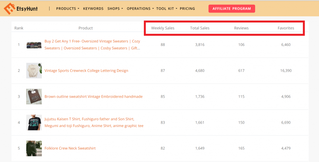 You can rank the best-selling vintage clothes based on sales at certain periods of time, total sales, reviews, and favorites.