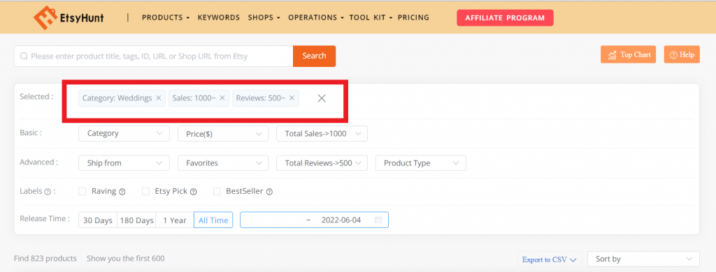 Now let’s have a close look at how to understand which products are sold more in the wedding category on Etsy. EtsyHunt Products Research Tool will be your first assistance with which you can easily list top products sold in the wedding category.