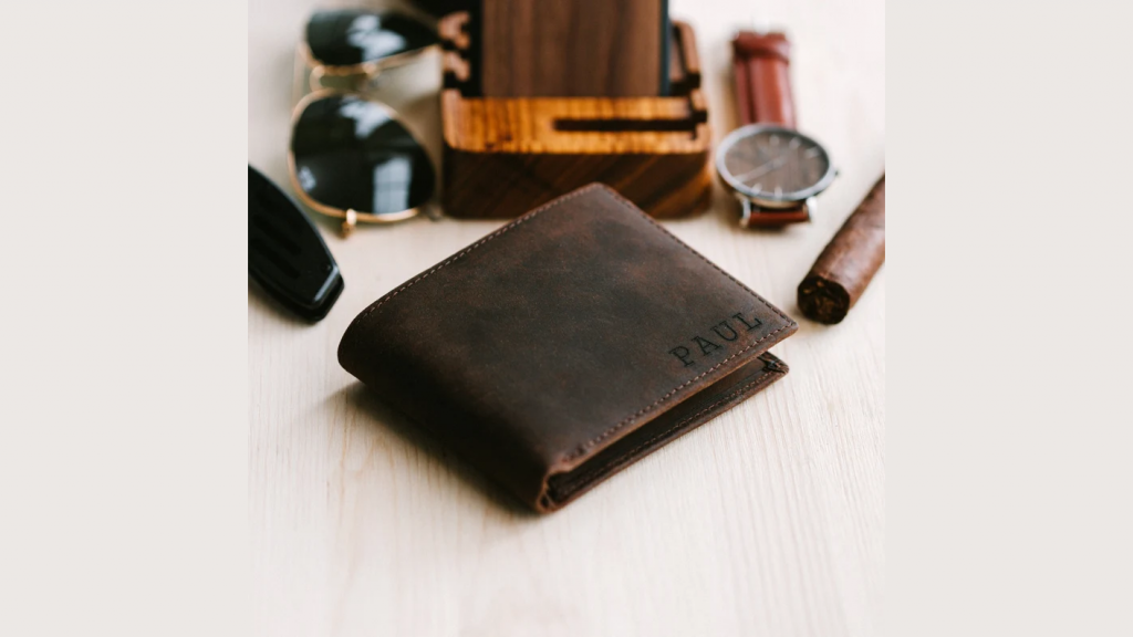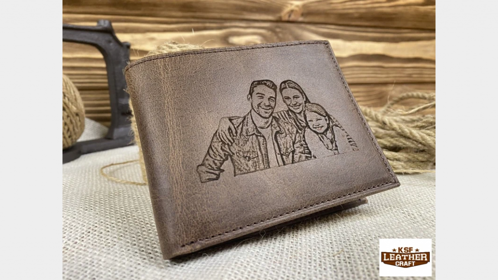 This leather wallet is created out of the best quality full-grain leather. It can be personalized with an engraving made with a laser engraving machine.