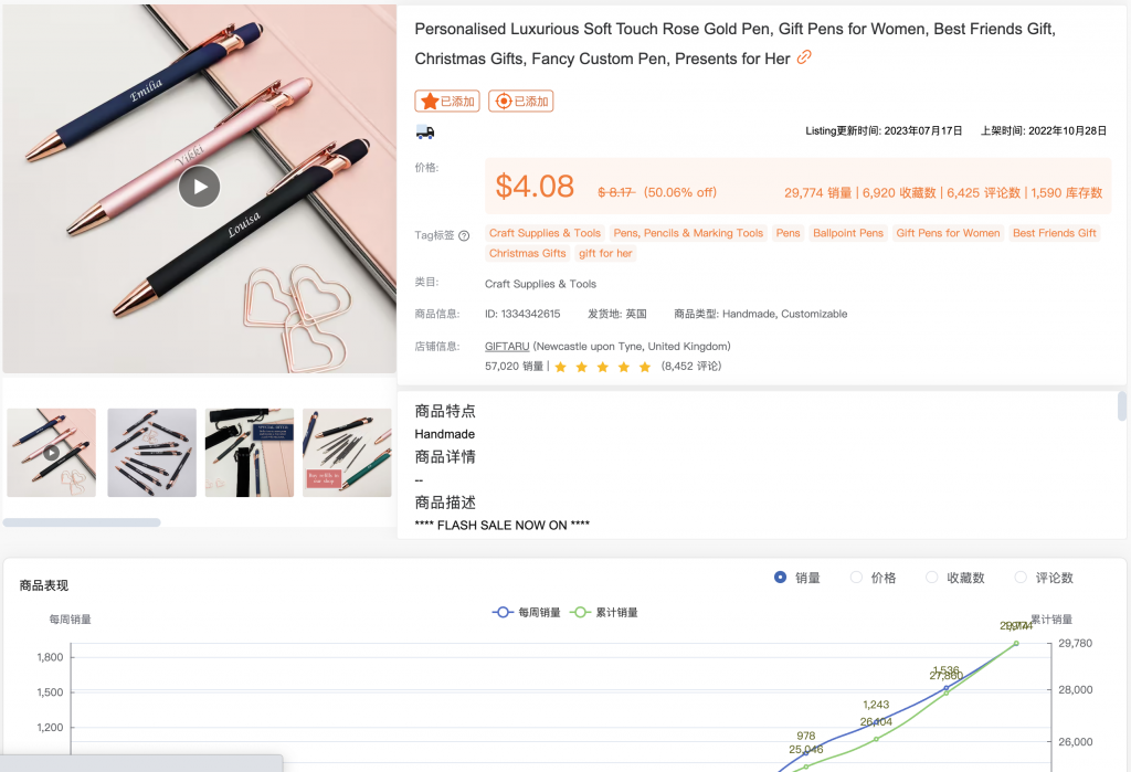 ● Product research: This feature allows you to find the most popular products, analyze competitors’ strategies, and discover new market opportunities. You can search for products by entering keywords or categories, and sort and filter the results by different indicators (such as sales, price, favorites, etc.). You can also click on each product to view more data analysis pages, showing the product title, description, tag, etc. This information can help you understand which products are the most potential, which titles, descriptions and tags are the most effective, and how to improve your own product listings.