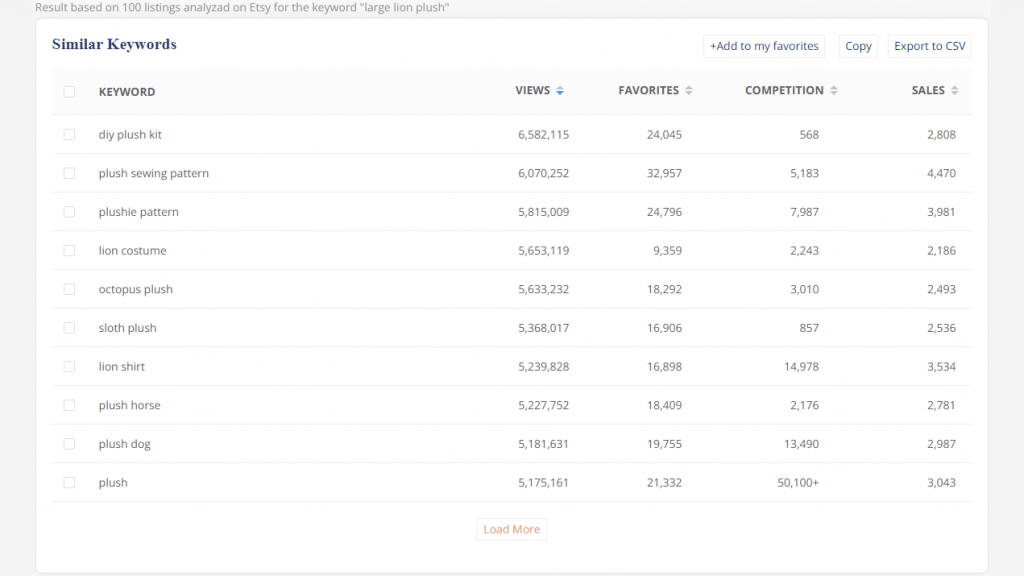 You can also use the keyword tool from EHunt to perform keyword research to find related and attractive keywords. For example, let’s take a look at the results of “large lion plush”: