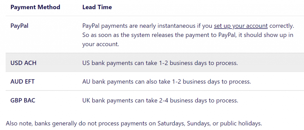 There are a bunch of ways to get paid on Redbubble. PayPal is the most common payment method among all. Besides, you can set up bank accounts. Here are lead times for each payment method: