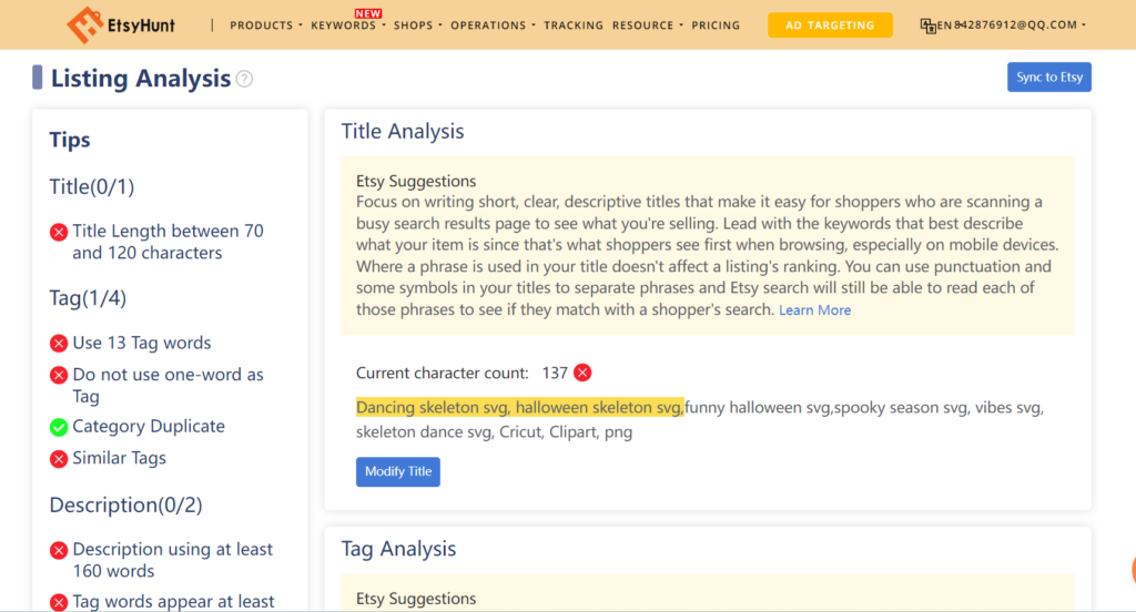 Etsyhunt Listing Optimization Tool can be used to check if your product's title, description, and keywords are accurate and meet the platform's requirements.