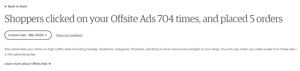 Sellers choose to participate in Etsy offsite ads. Etsy will promote the listings on high-traffic websites (including Google, Facebook, Instagram, Pinterest, and Bing) to attract new buyers directly to your shop.