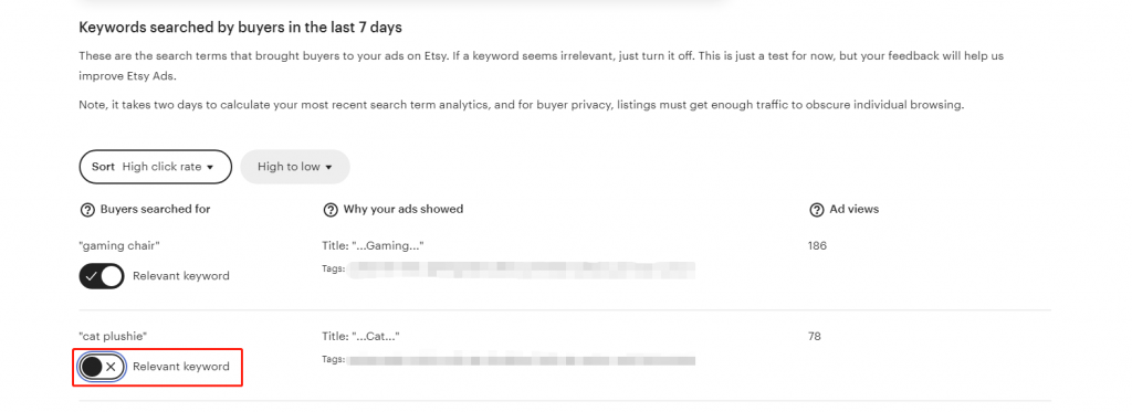 You can actually search with the customers’ search keywords to see whether the results are related to the listing to be promoted, and decide whether to turn off the "Relevant keyword" button or not.