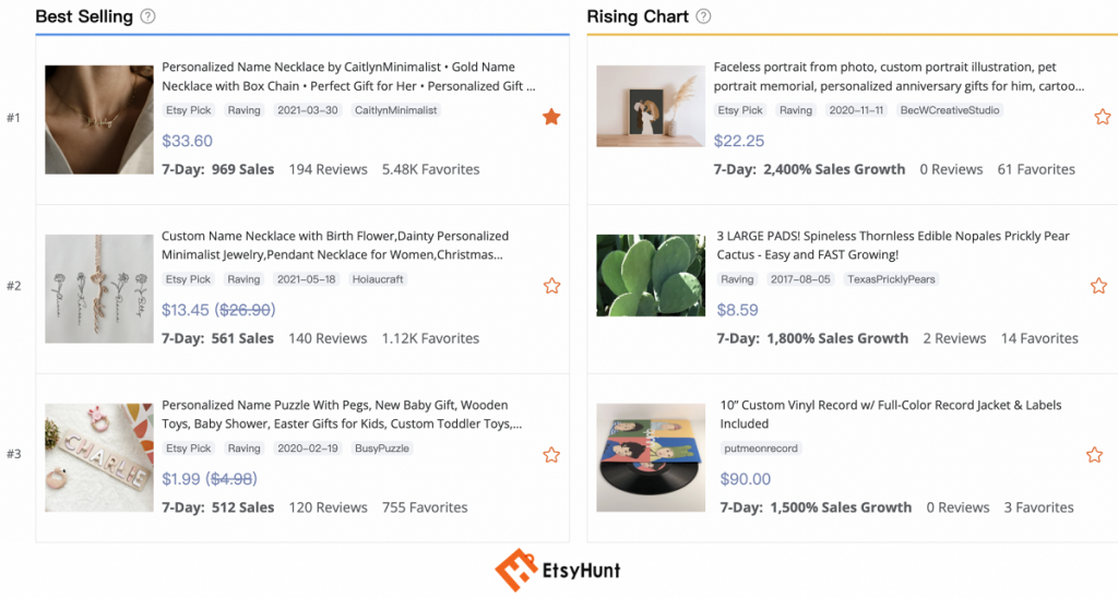 By EHunt, you can search Etsy product sales, favorites, review rankings. You'll know which products your customers love the most. Come to find the top niche products in your category!