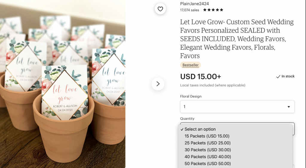 Example: This customized seed wedding gift is usually sold in multiple pieces, and the Etsy seller directly gives several fixed quantities for the user to choose from. In this way, even if the user buys 50 products at a time, the seller only needs to pay the $0.2 listing fee.