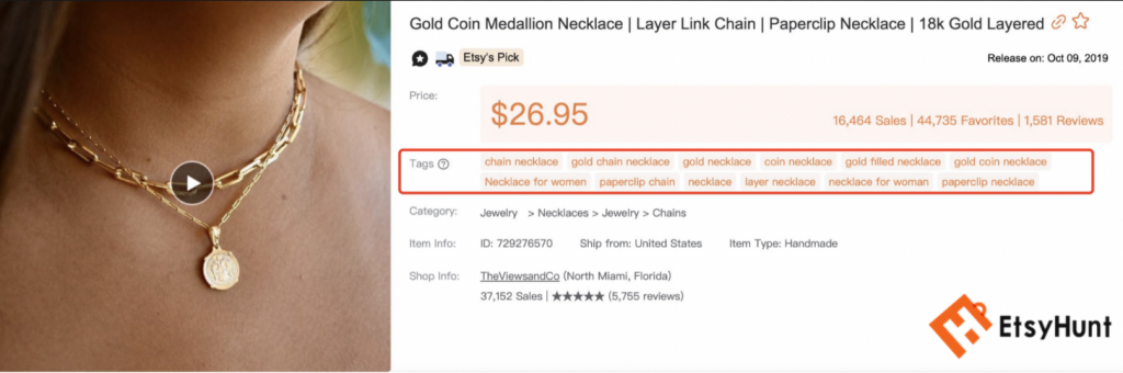 Etsy SEO can also be easily achieved with Etsyhunt! Would you like to see the keywords your competitors are using? Search the product name or URL in EHunt, find the product, and you can see its keywords in Tags. Click on each keyword, and you can see the market attention, competition difficulty, similar keywords, etc. of the keyword. Help you make a rational decision to choose the best keywords.