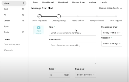 After enabling the custom orders, it is time to make a private listing on Etsy. Linda is an Etsy seller who sells handmade bowls on Etsy. One of her buyers, Madi, sent a message to Linda for a custom item.