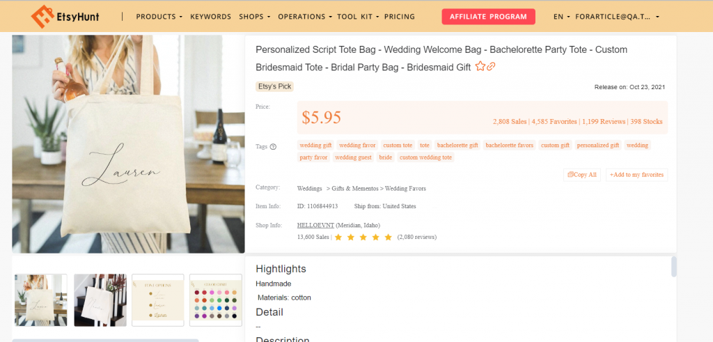 EHunt also offers the Etsy Rank Tool Chrome extension for free. This tool offers you every detail about the product that you analyze on the Etsy webshop.