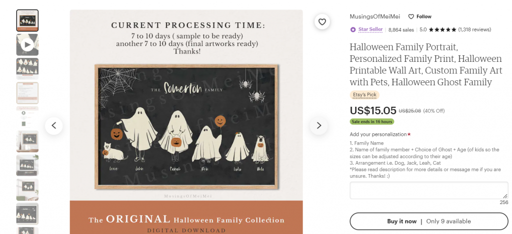 This creative Halloween family portrait item is number four on our Etsy business ideas list. This portrait has 1641 sales and 94 reviews over the previous 12 months.