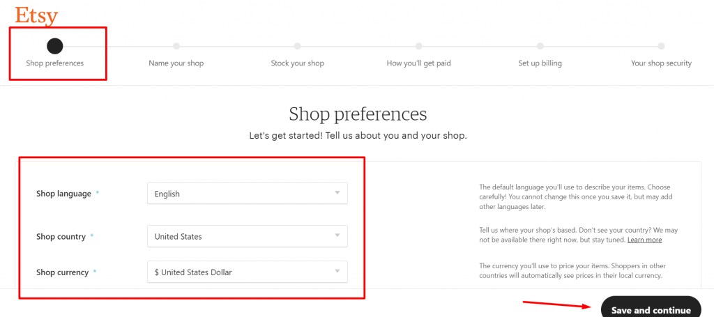 Here you can select a few basic settings such as language, location, and currency of your Etsy shop.