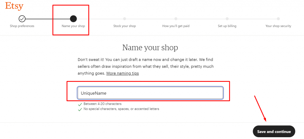 ⚠️ Your shop name must be between 4-20 characters. In addition, you can not use special characters, spaces, and accented letters in your store name.