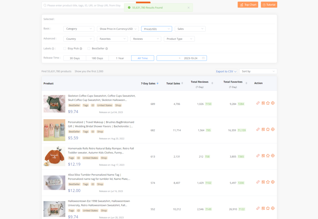 Product Comparison: Search and browse products on Etsy that are similar in style and positioning to your store, and examine detailed information such as total sales, weekly sales, number of reviews, favorites, pricing, images, etc. Filter and sort based on different criteria to find the most popular, profitable, or suitable products for your store. For instance, discover that some high-selling products use the following image style: "[Natural light] - [White background] - [Close-up detail]."