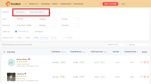 Furthermore, you can discover Etsy Star Sellers that have more than 10,000 sales by Etsy Shop Analyzer.