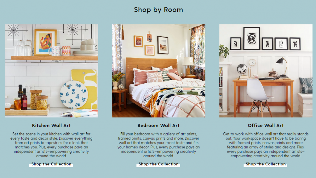 Society6 has an immense catalog of categories, with each one having a lot of subcategories where people can find whatever art they want. And wall art is not an exception. Users will be able to search through canvas prints, pictures, posters, wall hangings and many more decorations for the house.