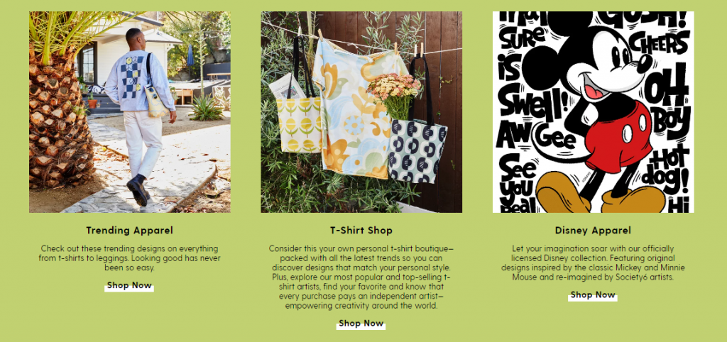 Collections offer many trending clothes waiting for the right customer to buy them. Many sales are being held almost everyday for users that search the t-shirt shop. Society6 even has an official licensed collection of Disney, where artists sell their products reimagining the characters of Mickey and Minnie Mouse.
